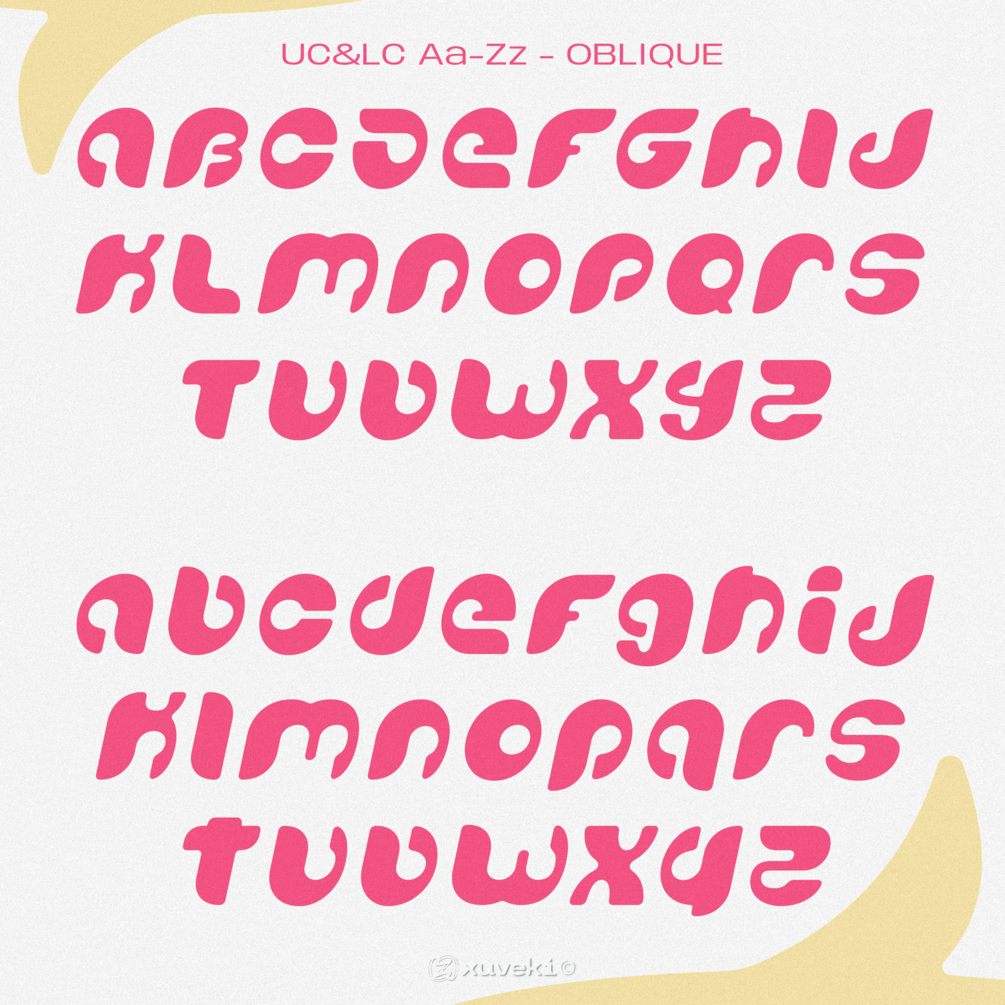It includes Regular and Oblique styles. The variable font file lets you choose any slant between the two. The oblique version is high energy and playful, while the regular version is a cuter take on retro 70's-90's type.